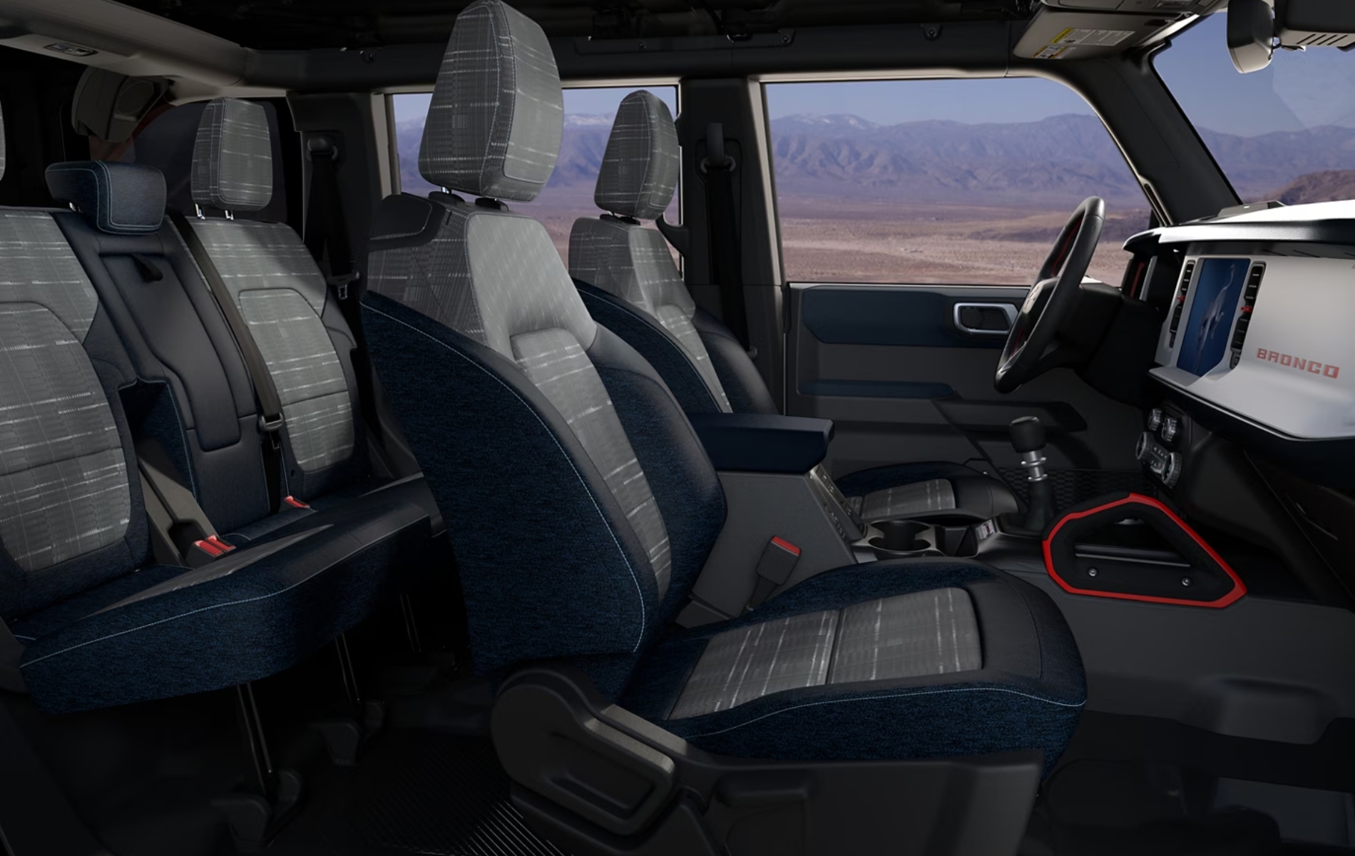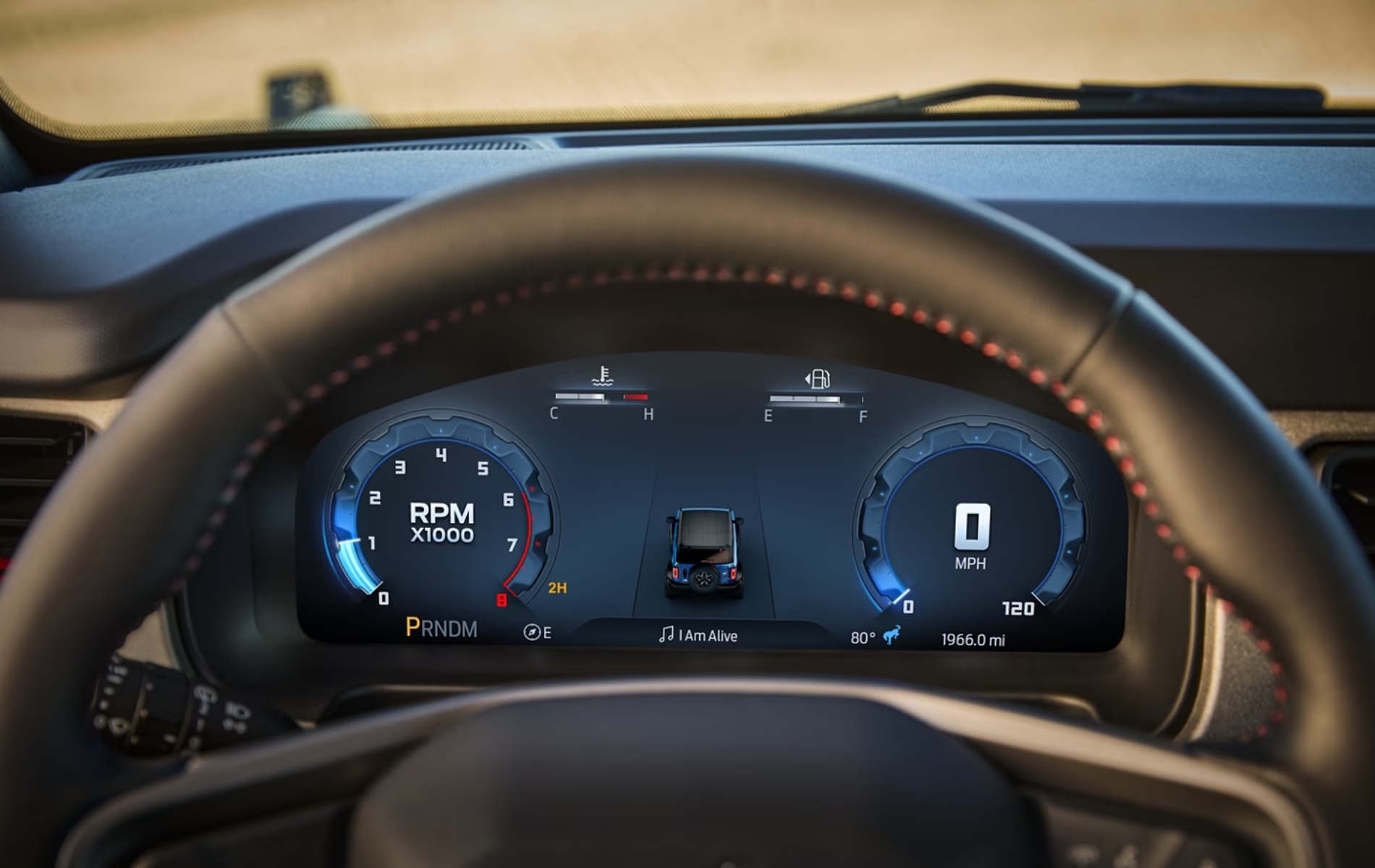 Inside, the Bronco Raptor balances rugged design with comfort. Standard marine-grade vinyl seats resist mud and water, while rubberized flooring with drain plugs makes cleaning easy after a long day outside. Heated front seats and dual-zone climate control add comfort during colder days. A MOLLE panel system on the seatbacks gives you a place to store flashlights, bottles, or gear within easy reach. With a removable roof and doors, every trip feels closer to the outdoors.